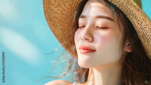 Beautiful asian woman wearing straw hat. Summer portrait against blue background.