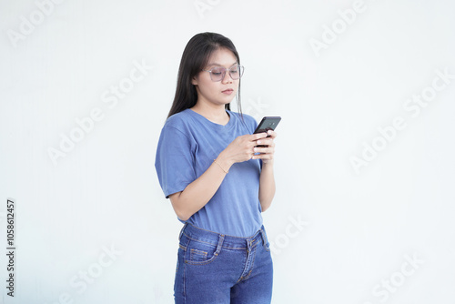 beautiful Asian woman with a serious expression exchanges messages on her smartphone against a white background