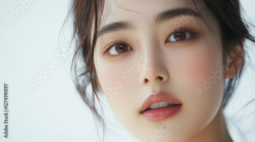 Beautiful Asian woman with full lips, clean skin, and glossy hair, with natural makeup on her face, generative AI