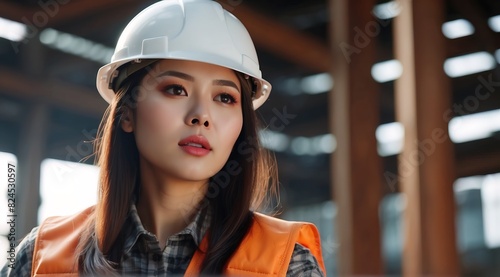 Beautiful attractive asian woman model working on construction site wearing safety hat