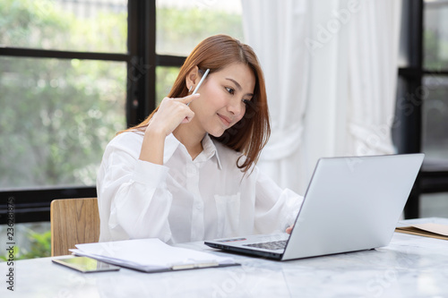 Beautiful Attractive Asian woman working with computer laptop and thinking to get ideas and requirement in Business startup feeling so happiness,Business Startup Concept