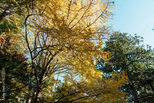 beautiful autumn day, yellow color gingko in forest, Falling autumn leaves in sunshine day. background, template and wallpaper for season change and vibrant colorful foliage concept