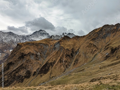 beautiful autumn hike in the beautiful swiss mountains Panorama picture with the first snow.Mountain peaks full of snow