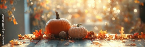 autumn, pumpkin, fall, harvest, leaf, nature, cosy, warm, light, background, seasonal, decoration, table, celebration, orange, festive, rustic, scenic, blurred, vibrant, wood, ambience, peaceful, foliage, tabletop, serenity, crop, traditional, environment, beauty, sunlight, closeup, texture, round, ripe, harvested, thanksgiving, natural, landscape, leaf, home, arrangement, colours, charming