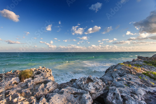 Beautiful bay with turquiose waters and rocky coastline of Xel Ha, Cancun, Mexico