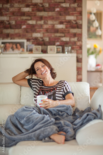 Beautiful best age woman lying on the couch relaxing, enjoying life, drinking coffee, carefree, happy mood