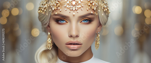 Beautiful blond woman with ideal skin wearing golden luxury jewels