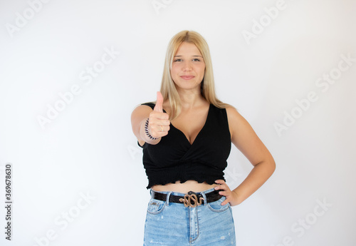 girl, young, woman, female, blond, long hair, teenage, smile, happy, shirt, black, white background, jean, thumb up, finger, gesture, gesticulate, positive, good, confident, student, model, natural, casual attire, summer, holiday, lifestyle, person, people, isolated, emotion, expression, studio, funny, joy, nice, friendly, 1, signs, cheerful, portrait, successful, caucasian, denim, gorgeous, beautiful, idea, cool, emotional, fun