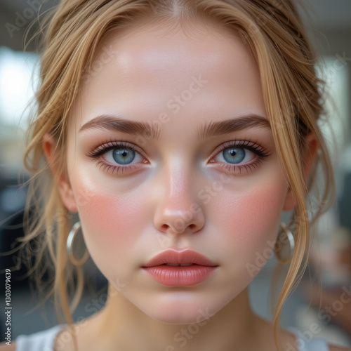 Beautiful blonde woman, portrait close up with joyful and serene facial expression, stunning blue eyes and fair complexion