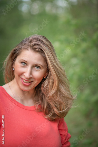Beautiful blonde young woman in a pink blouse in the park.