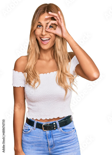 Beautiful blonde young woman wearing casual white tshirt doing ok gesture with hand smiling, eye looking through fingers with happy face.