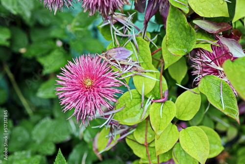 Beautiful blooming clematis flowers on background of green plants in the home garden. Odessa, Ukraine.