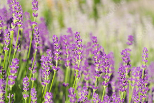 Beautiful blooming lavender plants in field on sunny day, closeup
