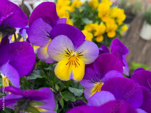 Beautiful blooming viola cornuta purple yellow spring flowers close up, horned violet in the flower pot outdoors