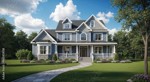 Beautiful Blue Colonial Style House with Wrap Around Porch and Lush Green Yard on a Sunny Day