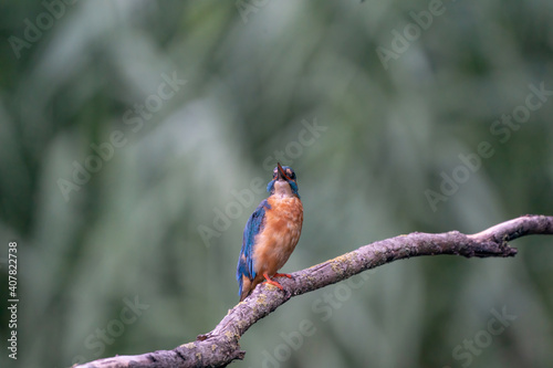Beautiful blue Kingfisher bird, male Common Kingfisher, sitting on a branch, in front