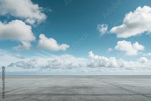 Beautiful Blue Sky Background with Cloud Horizon and Empty Concrete Floor, perfect for showcasing concept cars, ai