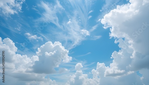 Beautiful Blue Sky with Fluffy White Cumulus Clouds - Serene and Peaceful Nature Background
