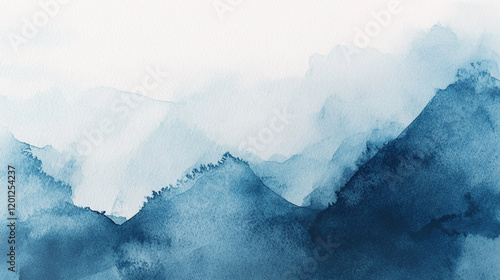 Beautiful blue watercolor mountain landscape with layered peaks and soft textures