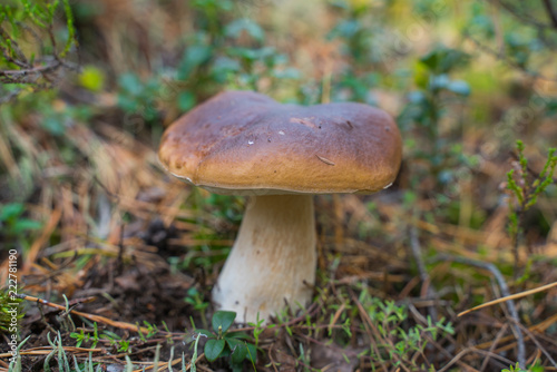 Beautiful boletus edulis mushroom growing in the natural forest.