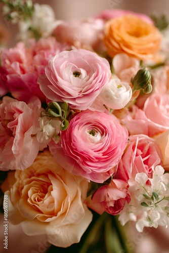 Beautiful Bouquet of Pink and Peach Ranunculus Flowers in Soft Lighting