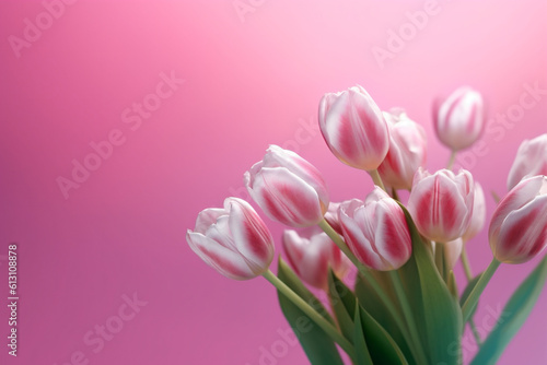 Beautiful bouquet of pink tulip flowers on pink background. Space for text. AI Generative