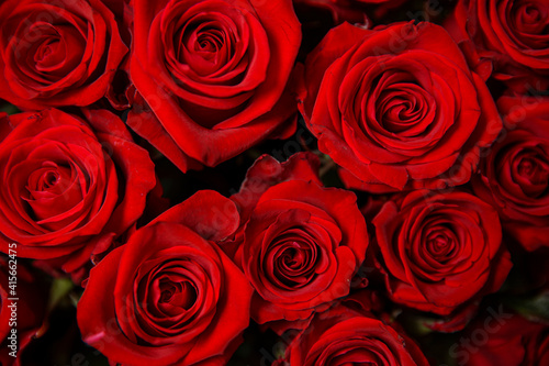 Beautiful bouquet of red roses, seen from above. Spring flowers. Wedding, women's day, mothers day and valentines day background. Selective shallow depth of field.