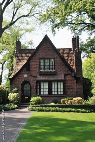 Beautiful brick cottage surrounded by lush greenery and well-maintained gardens in a peaceful neighborhood during a sunny day