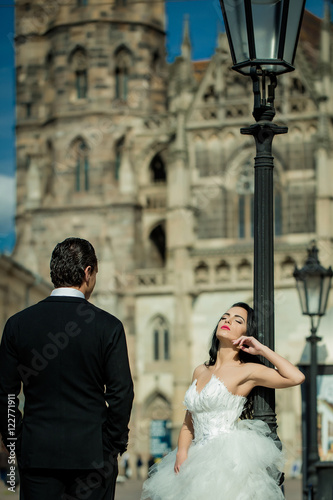 bride, woman, groom, man, wedding, fashion, photogenic, marriage, married, pretty, streetscape, dress, beautiful, urban, elegant, background, suit, pose, couple, outdoors