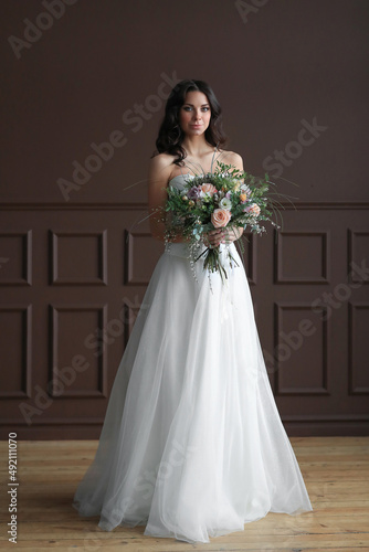 engagement, married, wedding, bridal gown, dress, white dress, elegance, bridal, bride, bouquet, blossom, blooming, floral, flower, beautiful, beauty, celebration, clothes, daytime, curly hair, female, girl, coiffure, happiness, happy, looking, portrait, lady, attire, event, gorgeous, lovely, traditional, tradition, interior, indoor, flat, apartment, posing, lifestyle