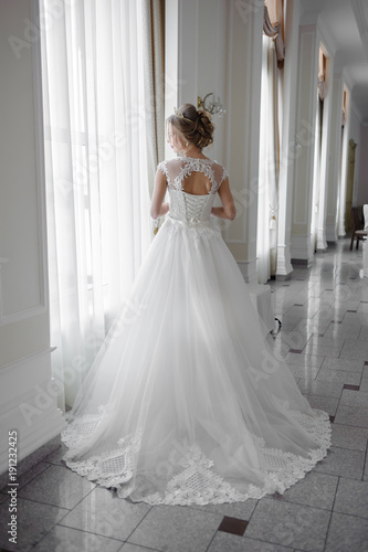Beautiful bride in wedding dress before wedding ceremony in great hall