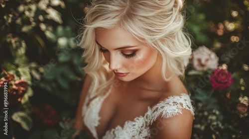 Beautiful bride with blonde hair in white lace dress and flowers.