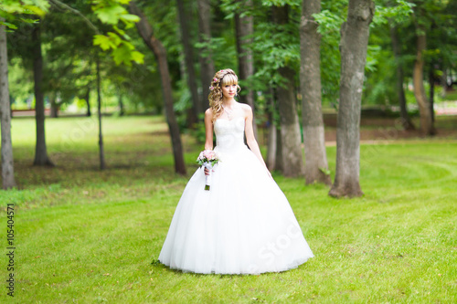Beautiful bride with wedding bouquet of flowers outdoors in green park.
