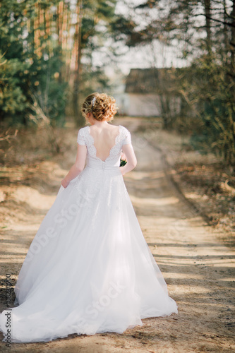 Beautiful bride woman portrait with bridal bouquet posing in her wedding day