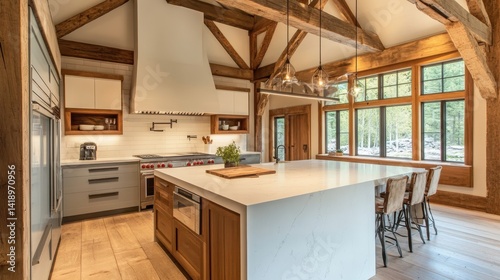 kitchen, island, beam, wood, design, interior, home, decor, cabinet, stool, counter, window, light, pendant, lighting, sink, oven, stove, appliance, refrigerator, faucet, dishwasher, microwave, bar, chair, flooring, hardwood, timber, truss, ventilation, hood, tile, backsplash, modern, rustic, farmhouse, style, elegant, luxury, bright, open, concept, roomy, cosy, comfortable, architecture, house, residence