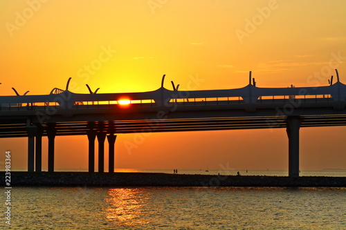 sunset, bay, sea, modern, bridge, silhouette, people, walking, coast, float, boat, ship, yacht, sun, ray, evening, ocean, summer, reflections, gulf, landscape, background, road, way, water, nature, scenery, travel, sky, transportation, light, illumination, architecture, beautiful, beauty, beach, shallow, sail, shelf, down, bright, orange, yellow, red