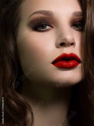 Beautiful brunet model woman face with green eyes and perfect make-up. Portrait of beauty young brunet girl with red lips and smoky eyes, thick eyesbrow . Female face with clear skin close-up.