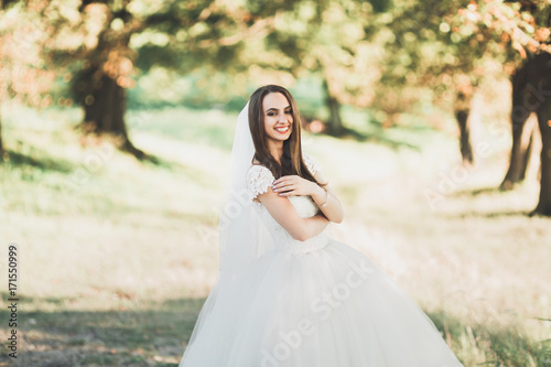 Beautiful brunette bride in elegant white dress holding bouquet posing neat trees