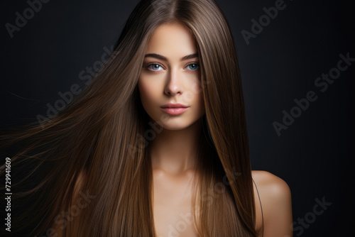 Beautiful brunette girl with long, smooth, healthy hair on a dark background