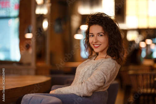 beautiful brunette in a gray knitted sweater posing on camera in a cozy warm cafe in a cold autumn