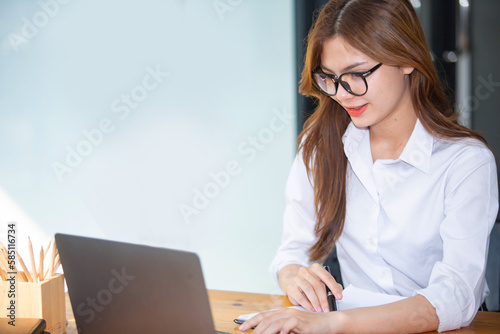 ฺBeautiful business woman work happily Using a computer, tablet, phone, in the morning, warm light