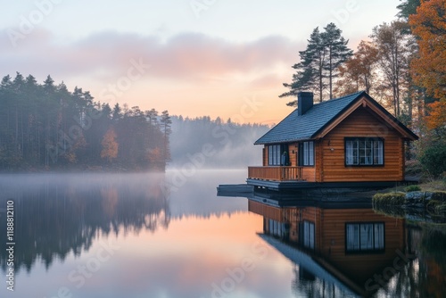 Beautiful cabin by a calm lake in a scenic forest