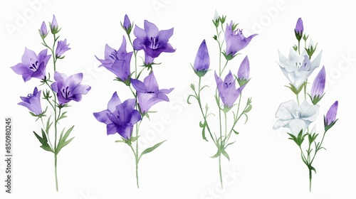 flower, bellflower, watercolor, illustration, purple, white, background, floral, design, botanical, garden, nature, artistic, decorative, beautiful, colourful, delicate, intricate, whimsical, spring