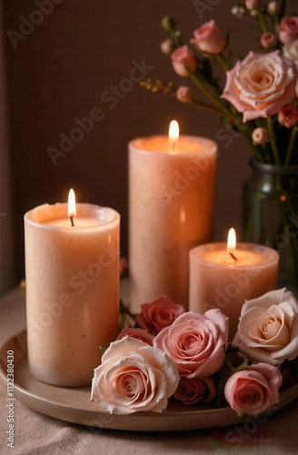 Beautiful candles color mocha mousse next to flowers. Trend color of 2025
