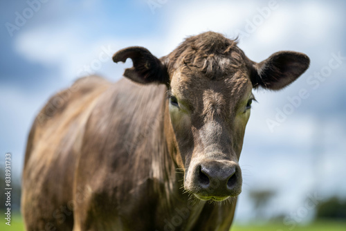 beautiful cattle in Australia eating grass, grazing on pasture. Herd of cows free range beef being regenerative raised on an agricultural farm. Sustainable farming of food crops.