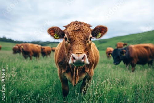 beautiful cattle in Australia eating grass, grazing on pasture. Herd of cows free range beef being regenerative raised on an agricultural farm. generative ai