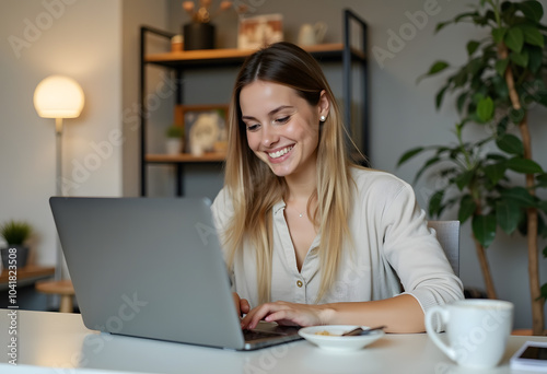 Beautiful Caucasian Female Student Working on Her College Degree Thesis on a Laptop Computer in Library. Young Stylish Female in a Yellow Jumper Studying an Online Course Alone in a Reading Hall. High