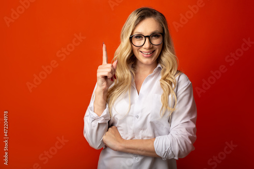 beautiful caucasian female wearing glasses with hand gesture