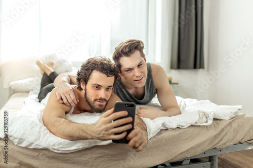 couple, young, guy, together, love, relationship, unusual, use, smartphone, mobile, phone, gay, bed, home, alternative, caucasian, sex, homosexual, homosexuality, lifestyle, partner, people, human relationships, tolerance, 30s, adult, boyfriend, casual attire, electronic, feeling, family, homelike, man, orientation, lover, sex, relax, affection, individuality, care, selfie, lying, bedchamber, leisure, cheerful, partnership