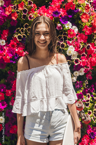 beautiful cheerful girl smiles broadly, stands against a background of flowering viols behind her